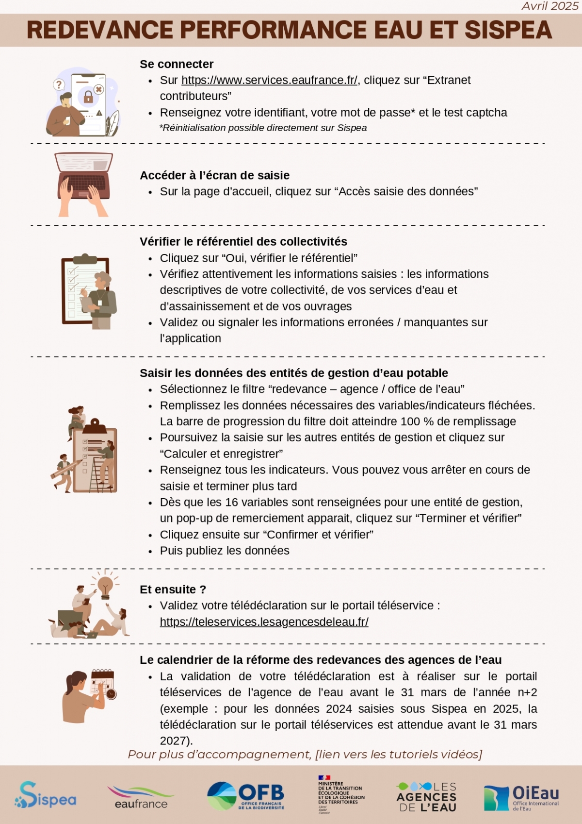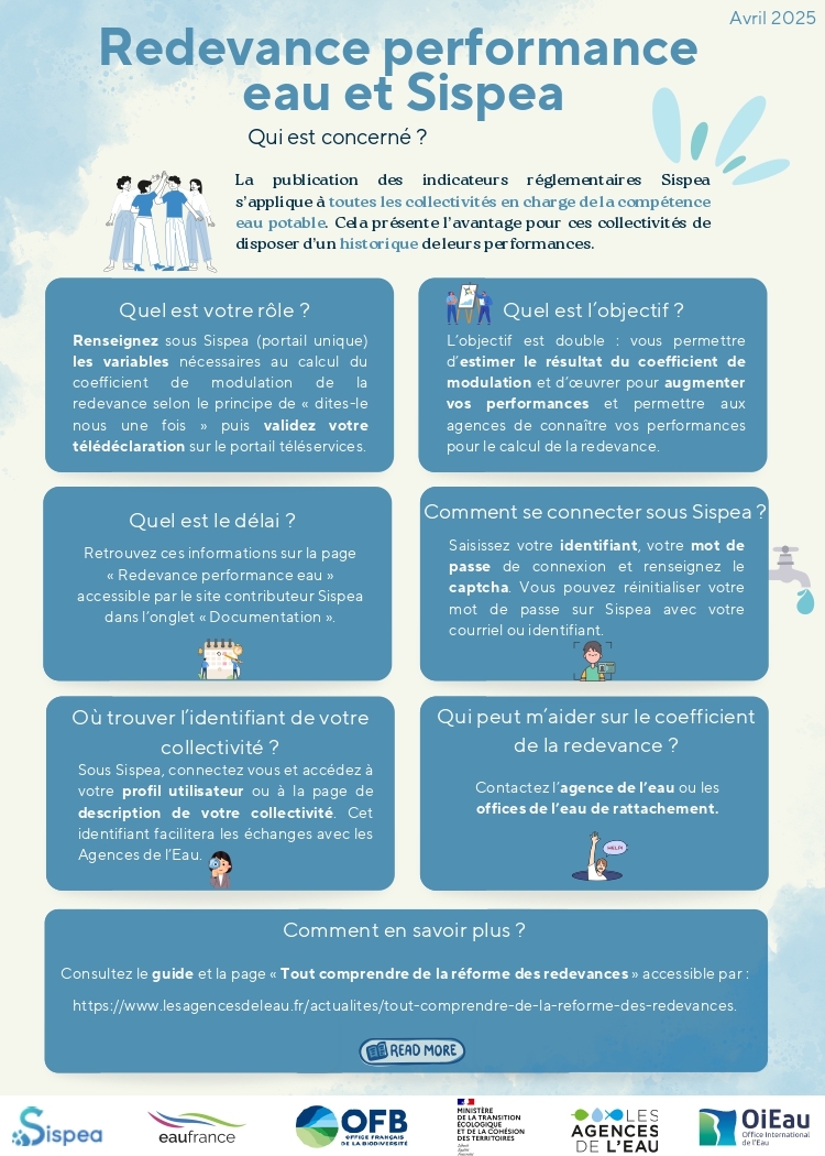 | Plaquette générale de SISPEA | Redevance performance eau et Sispea, pas à pas |